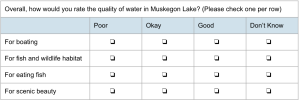 Other researchers create their own surveys to collect data on locally relevant issues. For example, in the Social Science Lab we recently asked residents in the City of Muskegon, Michigan about their impressions of the Muskegon Lake restoration, including current water quality in the lake.