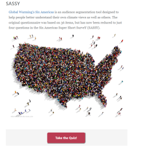 Bear with me. The Yale Program on Climate Change Communication is a group of social scientists studying public opinions and behaviors related to climate change. Their goal is to inform communication strategies used by public and private organizations engaging in climate education (YPCCC 2022). The program developed a four-question “SASSY” survey to classify people into one of six groups, from “alarmed” to “dismissive,” according to their level of concern about climate change. Use the link at right to access the survey and click through the questions (you don’t have to answer honestly, just screen the survey questions).